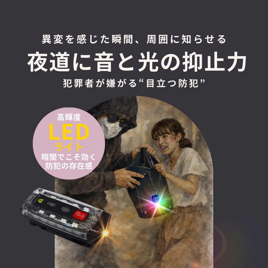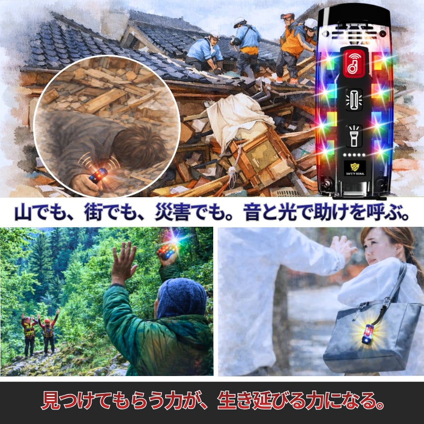 SAFETY SIGNAL(セーフティシグナル)は、山岳遭難、家屋倒壊、夜道の危険など、声が届かない山中や捜索困難な夜間でも、高輝度LEDシグナルと110dbの大音量電子ホイッスルで自身の居場所と異常を周囲に伝えることができます。